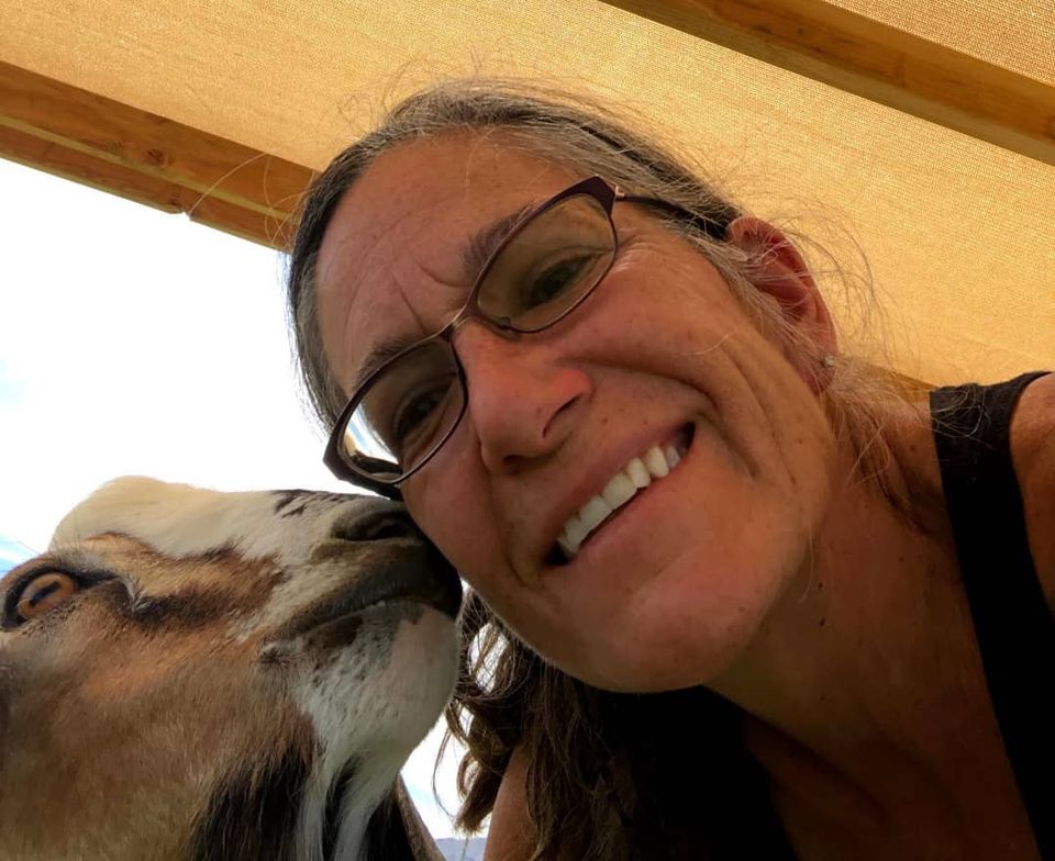 Vicki of Blue Sky Organic Farms and one of the farm’s goats.
