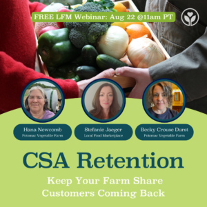 If your CSA is like most, attrition is your biggest challenge. It takes time, effort, and money to get customers to sign up, and every year they stay with you, the returns on that investment grow. But when your customers aren’t signing up year after year, the costs of attracting new ones can add up fast. In this webinar, we’ll cover some strategies you can use to keep your CSA customers coming back season after season, growing their value and deepening your connections to the local community. We reached out to some organizations that have made the subscription model work for them to find out what they’re doing right. You’ll hear from Hana Newcomb and Becky Crouse Durst of Potomac Vegetable Farms.